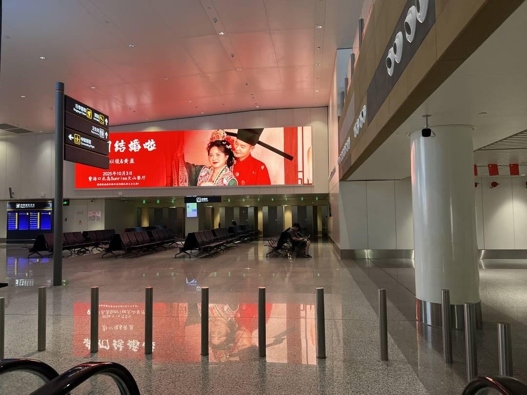 10月19日,新娘黄女士向封面新闻记者还原了这场“高调浪漫”的幕后故事。她与丈夫彭先生的婚礼已于10月3日圆满礼成,而包下机场屏幕发请柬,是两人共同的主意。“我是海南人,先生是广东人,结婚当天双方亲友都会从美兰机场落地,这里是大家抵达的第一站。”黄女士说,希望亲友一出机场就能看到喜讯,能在承载着祝福的大屏下合影留念,也想把这份幸福分享给所有陌生旅客。